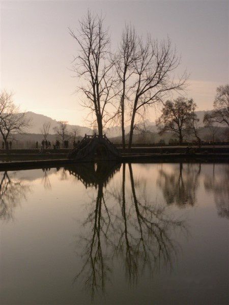 村中主要景观是四栋木雕石楼,雕刻得精美绝伦,有平面雕,浮雕,缕空雕各种技法,每扇门窗的雕刻都有一个典故,并配诗,人物面部栩栩如生,动物连身上的毛都刻得细微 ? 清晰可见,只可惜历经文革浩劫,大部份人物头像被毁,留有遗憾.下午2点左右返回宏村参观不禁感叹其设计与布局的精巧,宏村的水系是重点,村落中一口月形池塘将山间的泉水(阴水)与村边河上游的水(阳水)汇集再通过人式开凿的圳将水收注各家门口,每家每户一踏出门便有水圳,村民日常的洗刷都在水圳里完成,至今未变,圳中还有小鱼来回游动,坟外有南湖蓄所有阴阳水,用以灌溉村外农田,坐在南湖边的石凳上,看着青山绿水白墙黑瓦,一派纯朴自然的田园风光,难怪全国各地高校的艺术设计系师生们都热衷于来此地写生,照景描画,无需渲染和处理,宏村的每个侧面都是一幅韵味独特的图画。索兴仰面躺下,看着头顶蓝天白云,听着树上蝉鸣,思绪随风飘扬。