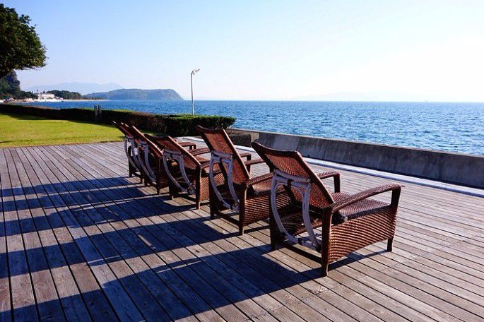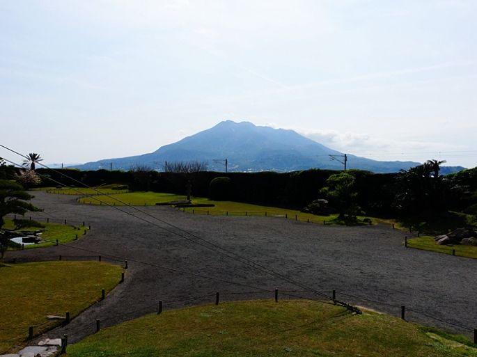 早饭后并不着急,在酒店里溜达一圈再搭免费的班车去指宿站。白天的后花园可以看到蔚蓝的大海,视野极好,比晚上要好看更多,都有点舍不得走了。