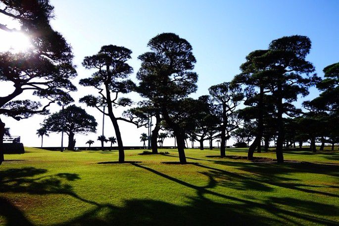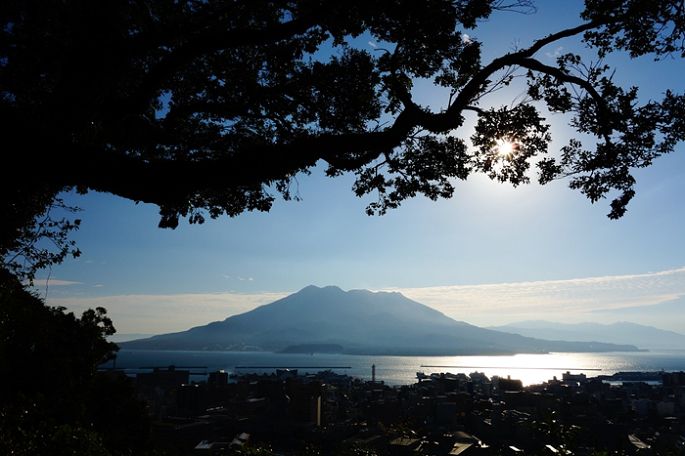 城山公园的展望台是欣赏樱岛火山的绝佳地点,在海拔107米的小山坡上,从树林枝叶的缝隙中远眺樱岛、锦江湾及鹿儿岛的市街。樱岛,就像阳光中的一抹剪影,美到让我留恋。