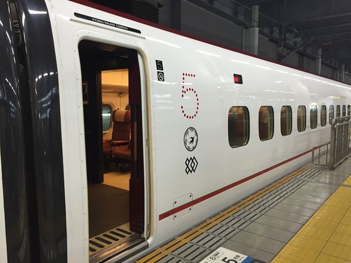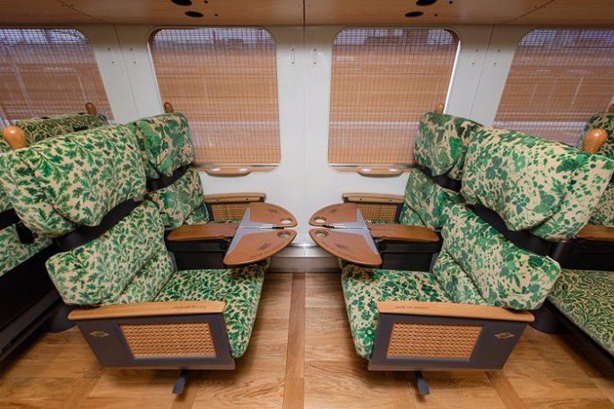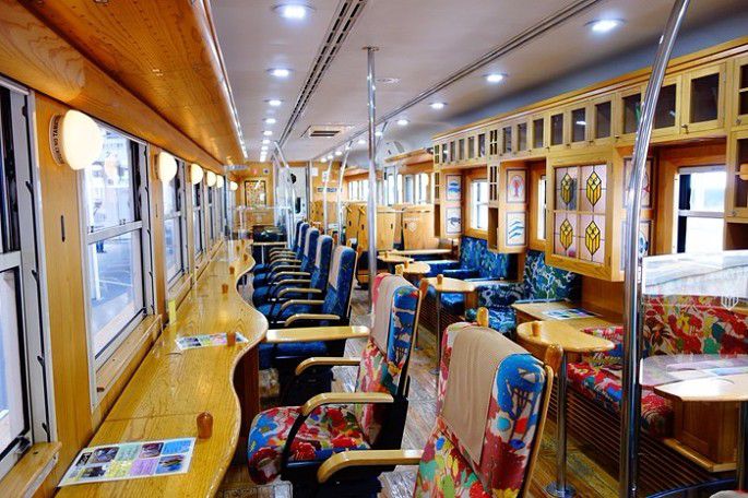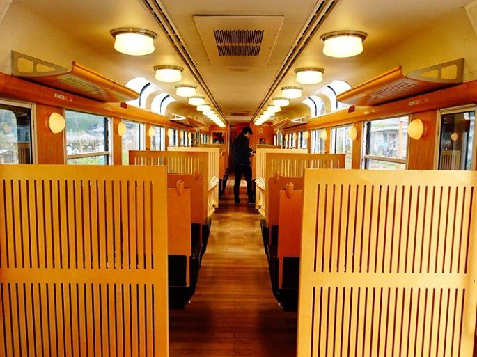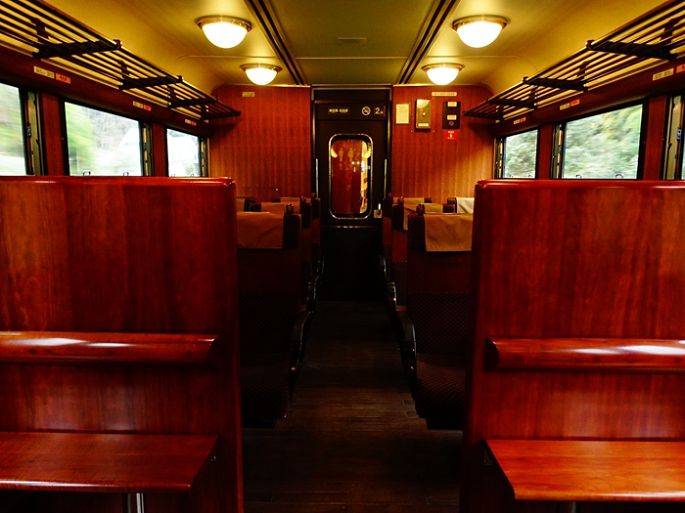 下午要体验是隼人之风号!据说,列车名取自一位叫隼人的武士,黑色的外观看似冷酷,内饰却采用完全不同的色调,两节车厢都使用的木质的材料,一节沉稳大气,有种回归旧时代的风情,另一节则是温暖的原木色,恬静怡人。