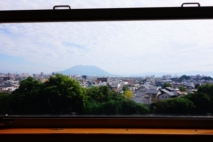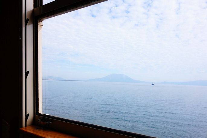 分分钟后车厢里居然坐满了人,暗暗庆幸自己拿到一个绝佳位置,可以从车窗内眺望海那一头的樱岛火山。