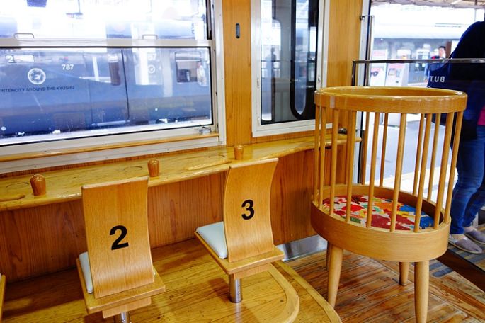从由布院回福冈,乘坐的列车是我向往已久由布院之森号,亮绿色的车身绘着绿植的内饰,坐在其中仿佛自己变成了仙子,在森林中穿梭。