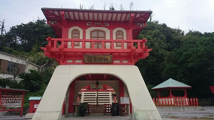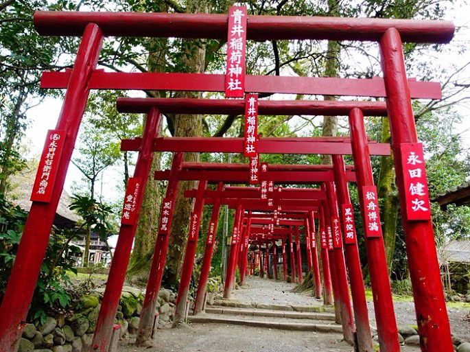 长崎鼻是萨摩半岛最南端一个三角形的海岬。这一带流传着关于浦岛太郎的传说,所以此处供奉着一座龙宫神社。在这里祈福的特色是将愿望写在贝壳里,这样龙王就能看到啦。