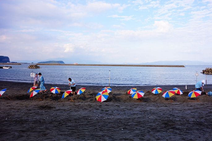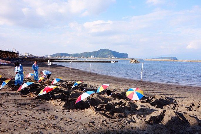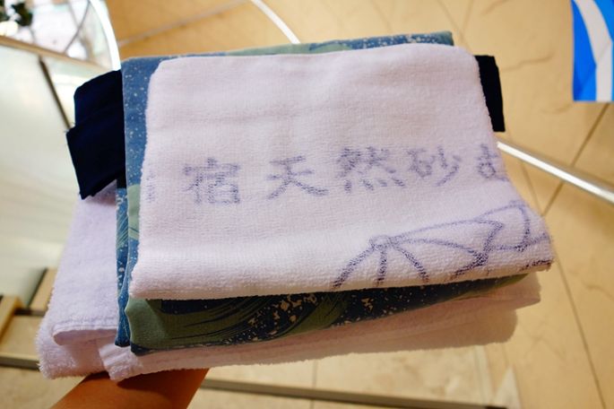 接下来要去体验砂蒸啦!指宿由于地处樱岛火山附近,海底滚热的温泉使得海边沙滩上的沙子都变得温暖起来。所以才有了独特的砂蒸。在砂蒸会馆前站下车,门票1080日元一个人,工作人员会提供专用的浴衣,毛巾可以自带,也可以在柜台买一条。