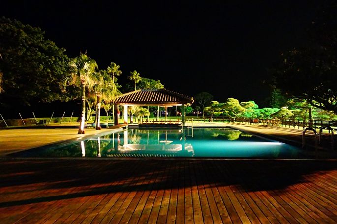 一顿美味下肚,整个人撑坏了,赶紧跑出来溜溜食。酒店身后,是一片宽广的绿地,树木都被修剪成日本特色的圆形,用不同颜色的光打出层叠的光景,像看到重影一样,特别神奇。