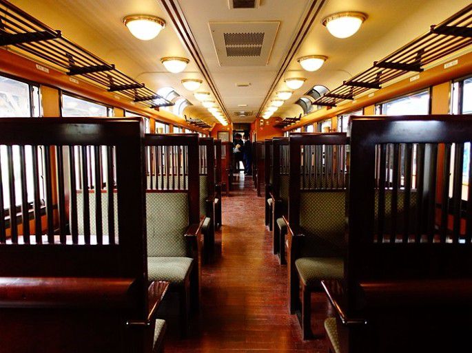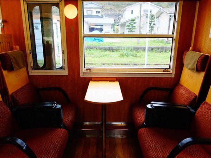 稍作休息,继续出发,新平号和隼人之风号是完全相反的风格,火红色时尚艳丽的外观与旧时代风情的内饰形成鲜明的对比,坐在车厢之中,仿佛穿越到6,70年代。