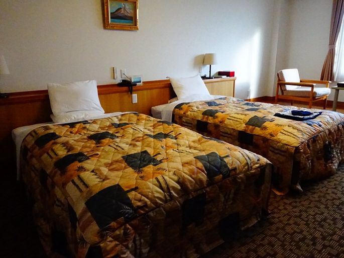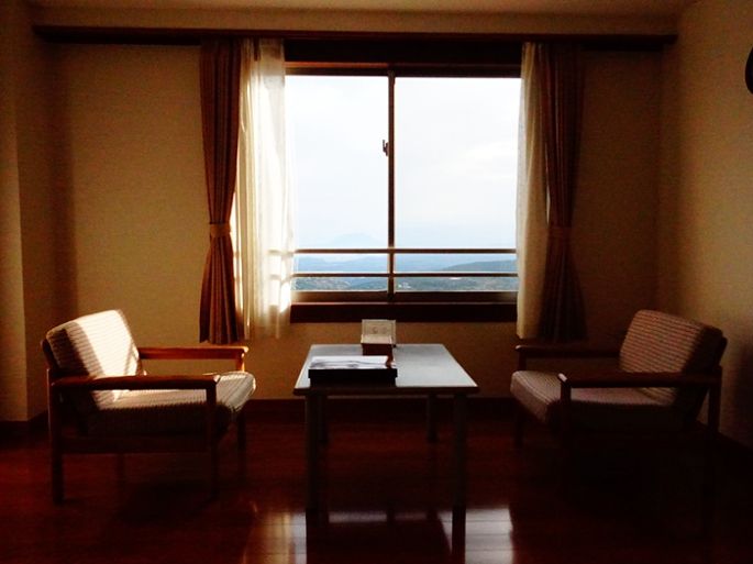 虽然热爱温泉,但日式的榻榻米多少还是住不惯,特地选的西式双床房,从房间内就能看到窗外连绵的群山,视野是极好的。