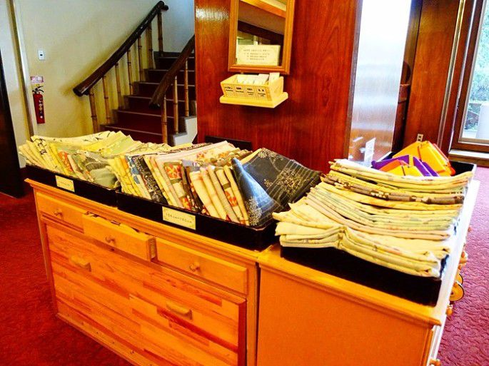 大堂内摆着各种花色和尺寸的和服,免费供客人在酒店内使用,酒店还提供租赁的绑带,如果想要拍出美美的和服照倒是可以租一条。终于可以挑选一件自己喜欢的和服了。