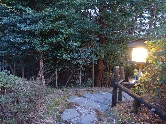 到了约定的温泉时间,到前台领取私汤门口用的挂牌便可以去泡汤了。一排木质的栅栏把围出一片私密的天地,小路两侧的灯火引着路,一直通向深处。