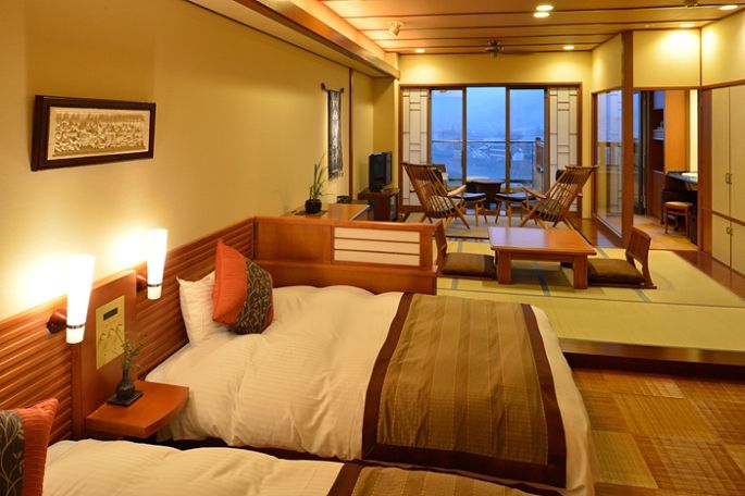 紧邻球磨川的一家大型温泉酒店,坐在房中就可以看到湍急的球磨川,位置极佳。