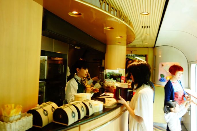 听说由布院之森的车上便当也非常有名,本想着中午少吃点在车上再买一个便当,没想到车上的小卖店早已排起了长队!等排到我的时候早就销售一空,实在是太火爆了。