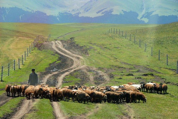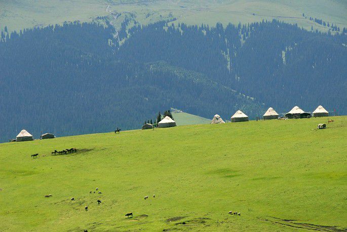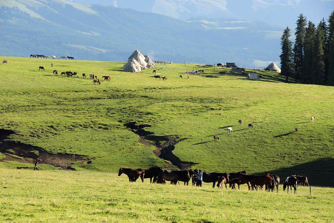 我慢慢给大叔讲:我刚从景区出来,原来经常走这条路,想去看看那几片颜色鲜艳的野花,同时也想看看前面森林里的大坡。大叔不听任何说辞,反而用生硬的汉语给我讲起了道理:现在这个喀拉峻,我们的不是,你的也不是,它是美国的,上面美国的照相机可以看见,这里保护,不让去。我不诧异他这么讲,因为他错误的把“申遗”当成送给美国人了,笑得我们一行人前俯后仰,直夸哈萨克老人的幽默非凡。