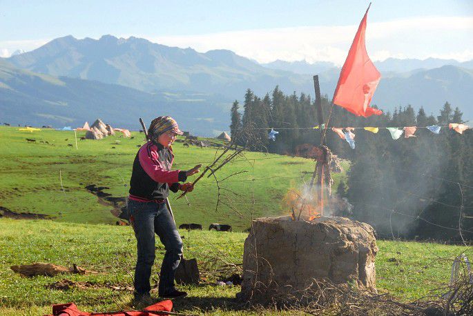 年轻的女主人点燃柴火,烧热囊坑,准备打馕。说实话,打馕我在市区见得多了,可在美丽大草原上看打馕这是头一次,我们好奇的这里看看,那里望望。不一会儿打馕的女主人耷拉着脸,嘴里不停的嘀嘀咕咕,不用猜,是对我们几个人不满。不知缘由,我小心的问她妹妹我们哪里做得不对?上汉语学校的妹妹说,姐姐埋怨我们看了囊坑,第一坑有的馕烤焦了,有的没熟!哦,原来这是哈萨克人讲究,我们不敢再去看囊坑了,尊重别人的风俗嘛。