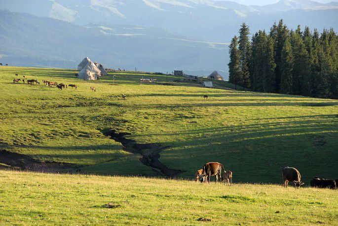 天堂般的喀拉峻,这里哈萨克毡房多了起来,牛羊优哉乐哉的在草原上啃食着无名的野花,不提有多幸福。说到喀拉峻的花,那可真称得上花的海洋,红的、黄的,紫的一大片一大片。海拔高,无污染,早晨一层薄雾散去,嫩嫩的草尖,粉粉的花瓣上挂着露珠,在微风中自由的摇摆;天空的白云,像刚吹出的棉花糖一样洁白,松软,在蓝天映衬下向草原那一边慢慢滑动;刚出生的小绵羊发出稚嫩的叫声,真让人好生可爱;出生不久的牛犊,憨憨的望着我们,似乎害怕?步伐有些僵硬弹跳着跑向牛妈妈;哈萨克妇女娴熟的挤着牛奶,看着草原上一帮外来之人,微笑间,露出金灿灿的牙齿,一派朴实与富裕。