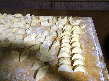 天色渐暗,看风景的人陆续回来了。和面的、拌馅的、擀饺皮的,准备工作做好了,会包饺子的人上阵了。来自东南西北的队友们,包的饺子各不相同,放在托盘里可谓济济一堂,真有得一看。饺子包好了,菜上齐了,酒也倒上了,外面白雪皑皑、大红灯笼也亮了起来,就是过大年的感觉。在家过年也没这么热闹,没这么多人,也没这么多年味——年味是越来越淡了。