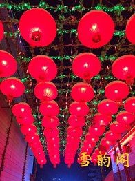 栈道走到尽头下来,往雪韵阁走。一条街的红灯笼都亮了,在白雪的映衬下格外温馨。街上的游客三五成群,保安随处可见,让夜游的异乡人很有安全感。街道两边有各种小吃:烤红薯、炖雪梨、冻梨、冻柿子、马迭尔冰棍……都要尝一尝;还有人家大门口各种造型、动辄两三米高的雪人,都要合个影。一路走下来,也是蛮忙的。