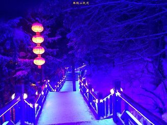晚饭后,去了棒槌山栈道。也就五、六点钟吧,天已经全黑了,栈道上幽蓝的灯光全都亮起来了,很唯美的样子。沿着栈道往山上走,不时与不知名的树相逢在栈道上——栈道傍山筑成,遇见让不了的树,就让它长在栈道上,而不是砍掉,这一点很让人宽心,人类很多时候太霸道了。走着走着,我们的脚步滞殆了,走不动了,一个真实的童话世界在我们眼底铺陈开来:盖着厚厚积雪的小屋、橘黄色的光晕、屋檐下的大红灯笼、后院里没有脚印的雪地、杂物树墩上各种形态的雪朵……如果院子的后门悄然打开,鱼贯走出几个小矮人,我想我也不会吃惊。那么的静,如果小屋会说话,大概会说:雪乡的冬天到了,我们什么也不用做,袖着手晒太阳;或者盖着厚厚几层雪被静静的做梦。