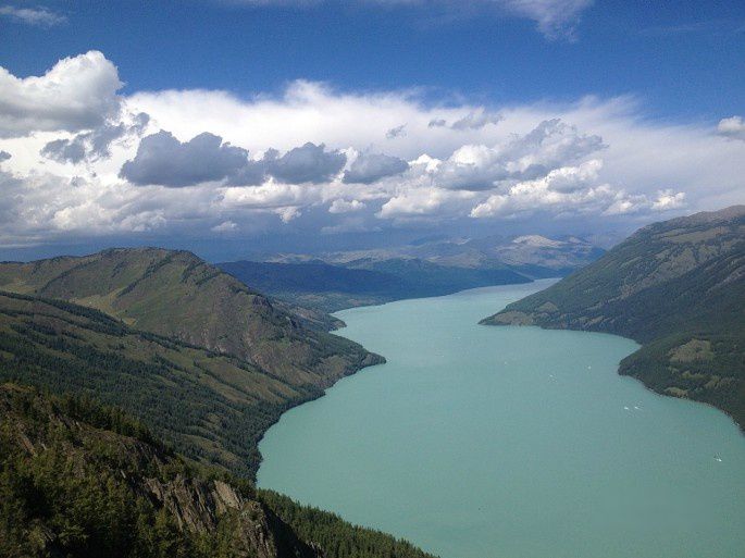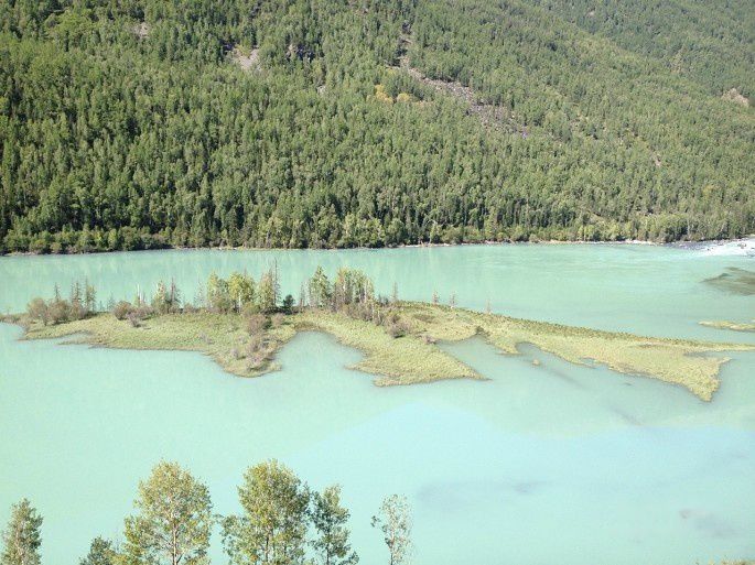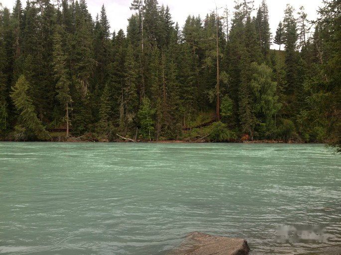中午12点吃团餐,25元一人,当然不会可口,分量少,价格高,但是在旅游景区吃的都贵,还没有选择的余地。到了景点后,坐区间车去观鱼台。山路蜿蜒曲折难行,但路旁茂密的雪松长得非常可爱,就是圣诞树的模样。喀纳斯湖水变化多端,桥右方水流端急,桥左方水平如镜,湖水色泽各异。观鱼台是座四角亭,传说是观看鱼怪的地方,成吉思汗把喀纳斯比作是神的眼睛。