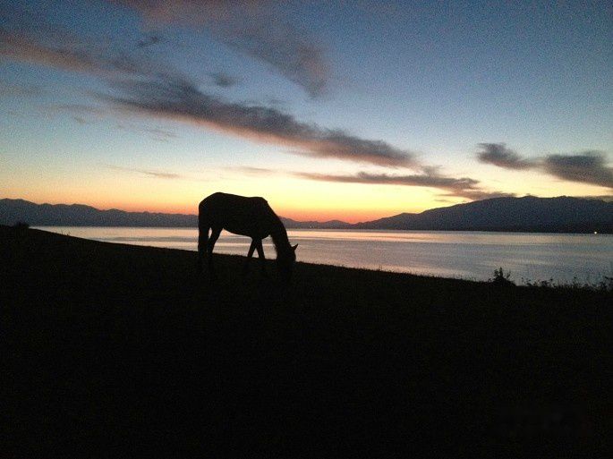 清晨7点钟走出毡房观赏晨曦中的赛里木湖,牧马静静地吃草,剪影美极了。等到太阳快出来时,牧民赶着成群的牛羊出来啦,9点钟太阳完全出来了,晒得草地泛着金光。