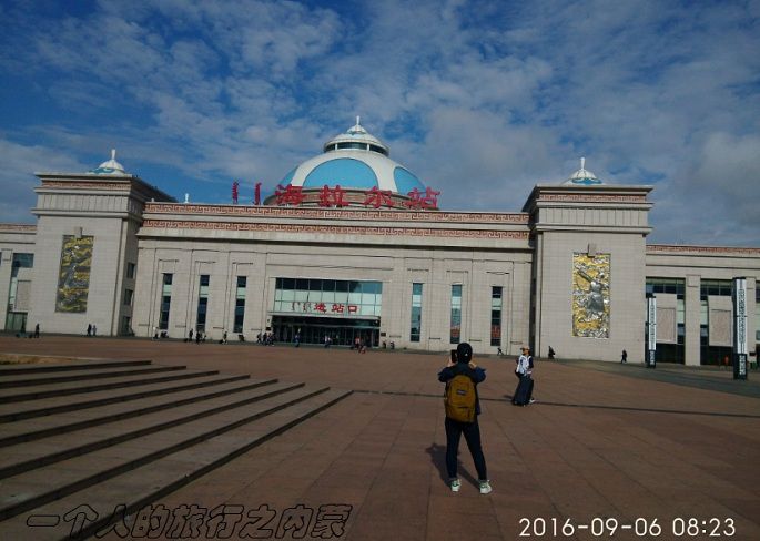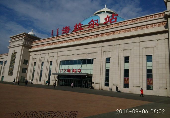 2016年9月6日,是我和另外三位女孩在蚂蜂窝相约在海拉尔汇合的日子。一大早,我和她们当中的两位MM(小美和肥包)从哈尔滨火车到达海拉尔。不愧是离俄罗斯较近的一座城市,这火车站都建得那么独具俄式风格。