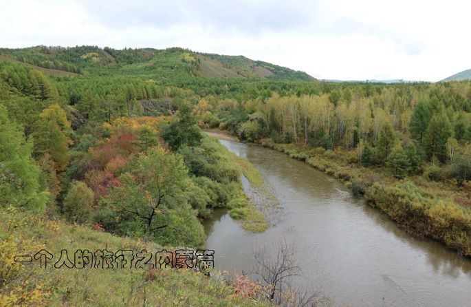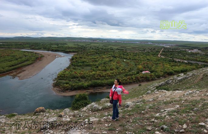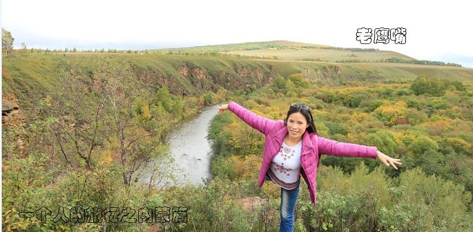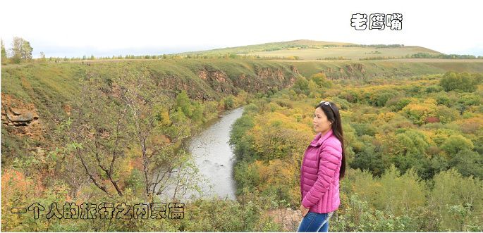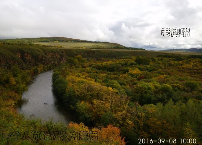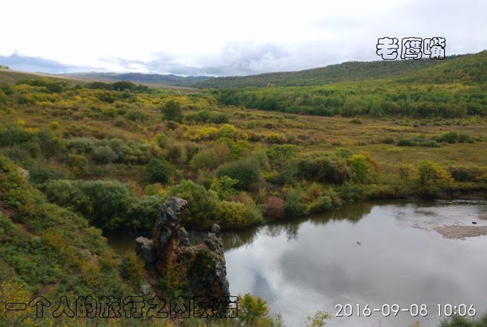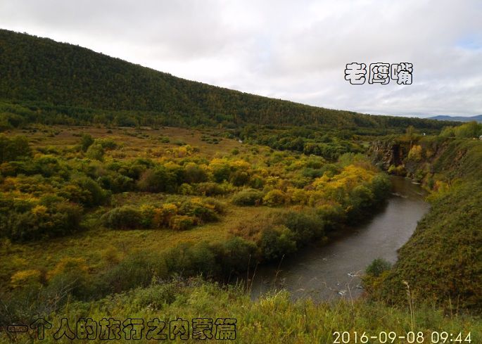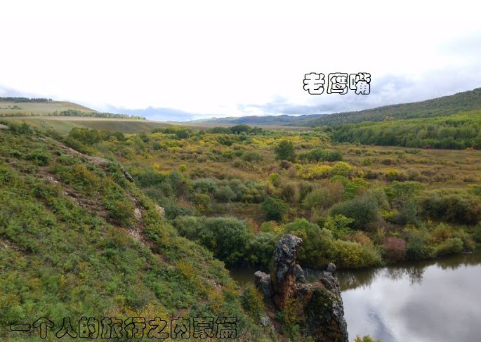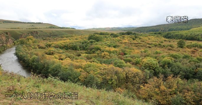 老鹰嘴其实就是耸立在半山腰的一个形如老鹰嘴的巨石,一条额尔古纳河的支流在这块巨石下流淌过,放眼东望,视野极为开阔,河湾,湿地,缓坡,层次分明,尤其是到了深秋,景色甚至是绝美,只是现在初秋,叶子还不完全变黄,不过这青黄不接之时,也有它另一番独特之美。