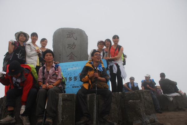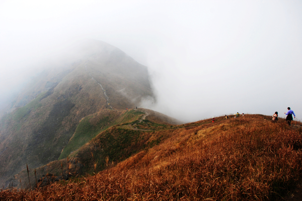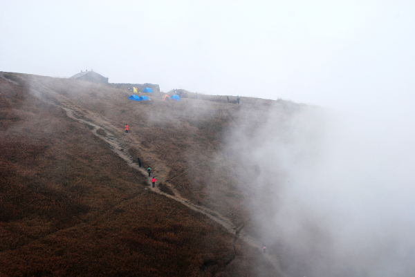 每一个比较著名的地都有一个叫金顶的所在:峨眉山的金顶,武当山的金顶,还有此处武功山的金顶!!游客很多,甚至还有旅游团的,一大群人咋咋呼呼的,他们下来我们上去,走的人多了,于是,变成了秃子。。。哦,金顶确实应该不长草!!相比较金顶,第一天的宿营地选在吊马庄是完全正确的。拍完大大小小的合影,我们开始去吊马庄,一路上全是游客步道,也发现了卫生情况明显好转,几乎看不到垃圾!金顶到吊马庄是一个半小时左右的路程,大家这个时候放慢了脚步,一路说说笑笑的,一起分享牛肉干肉脯巧克力。。。