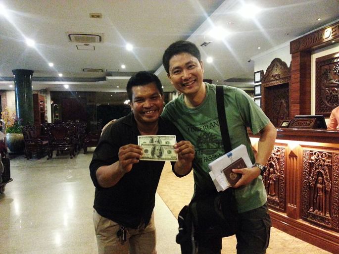 取完行李出来就看见我们在网上预订的出租车司机纳文Naven举着牌子接我们,到了预订的暹粒吴哥柳叶酒店办完入住手续,我们和纳文确定了这几天的行程,本来准备租2天的Tuktuk车再租2天汽车玩整个吴哥景区,和纳文一交流发现在旅游淡季4天都租汽车价格相差不大,直接就租2辆汽车玩4天,玩完所有景点还包括看日出日落总价是165刀,小费根据服务自己给,我们预付了200刀的定金,纳文很高兴还特地让我们拍了他手拿美金的照片,