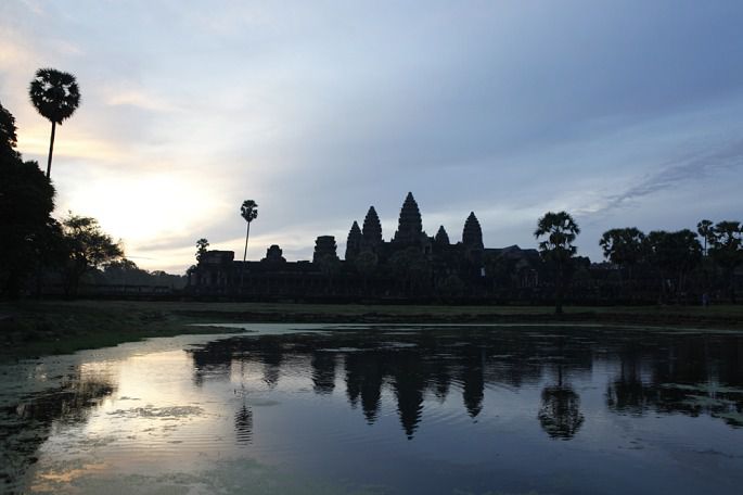 天气不错没有云,赶到小吴哥窟时天还是黑的,随着看日出的人群深一脚浅一脚的往湖边走,回廊和远处宝塔是黑黝黝的剪影,由于资金缺乏没有安装照明的设备,也正是没有这些让吴哥窟保留着那种原始的味道。