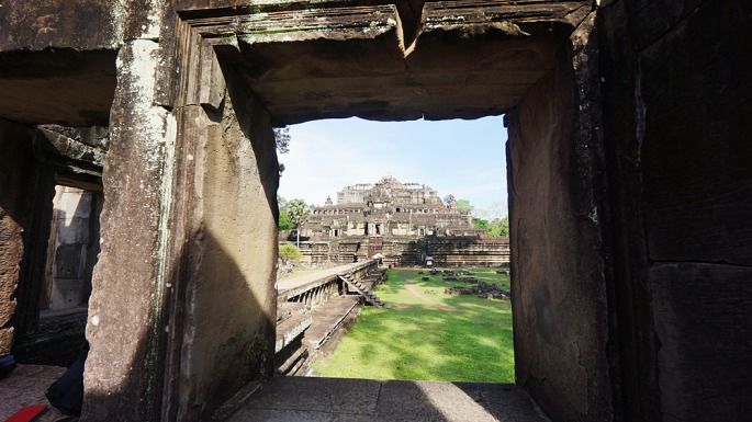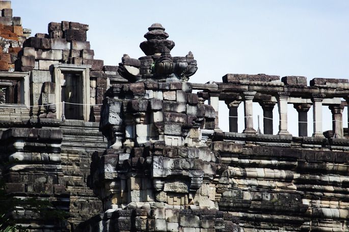 巴方寺(Baphuon):巴方寺又叫巴普昂寺在巴戎寺的西北200米的地方,据说其建设开始于苏耶跋摩一世统治时期,后来由乌达亚迪亚巴尔曼二世完成,它是吴哥城建设之前旧城的中心,现在大部分或已坍塌、或已被拆除,还有的建筑正在修缮。巴方寺是一座神山式的圣塔,坐落在一个高的基座上,而此基座是神秘的梅卢神山的象征。寺的砂石城墙为矩形,长425米,宽125米,巴方寺有一个特点就是东面有一座由三排短圆柱支撑着的桥,长200米,在桥梁中间有一座十字型的亭,我坐在十字亭的石窗上,静静的看着石桥那端的残墙断壁,几百年的风烛侵蚀仍然遮盖不住昔日的辉煌,穿过石桥走到主寺的基座旁边,写着编号坍塌的条石散落在池塘边和寺庙周围,层层叠叠的基座巨石向远处延伸,透着原始苍凉的神秘。