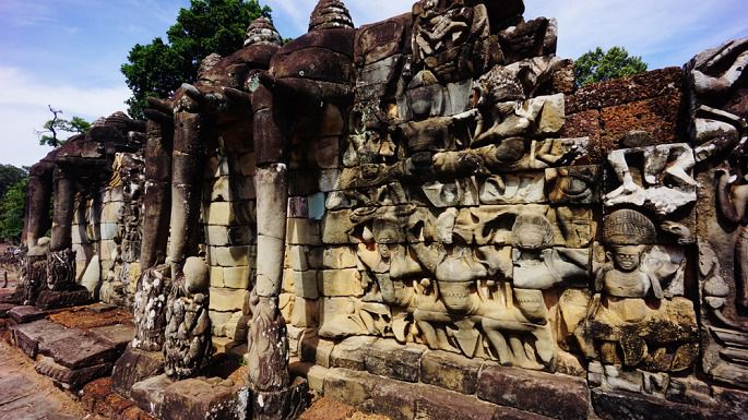 战象台(Terraceof Elephant)位于大吴哥城的中央,是用巨石垒成的一片很大的建筑。从巴方寺出来后就是战象台,这里是皇家举行庆典仪式的场所,也是政要迎宾检阅的地方。战象台平台有两层,一层为方形,另一层沿着基座有圣鹅雕塑。平台最吸引人的地方是两侧的大象雕刻,象身上还有朝臣及骑手。