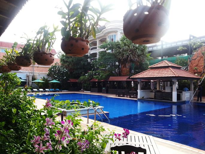 6月的柬埔寨虽说是雨季,不下雨出太阳的时候绝对的暴晒,中午还在吴哥城里逛的基本都是旅行团的,所以我们每天中午都回酒店吃饭休息或者游泳,酒店的环境很不错,每天都是睡了午觉再出发去玩。