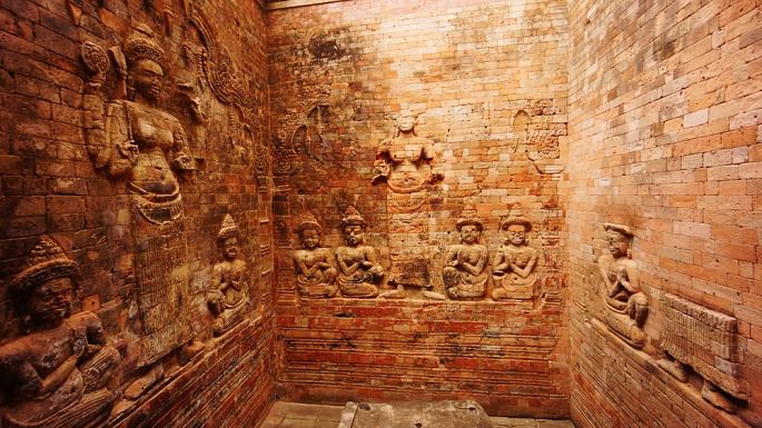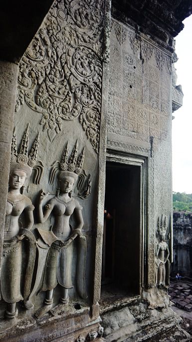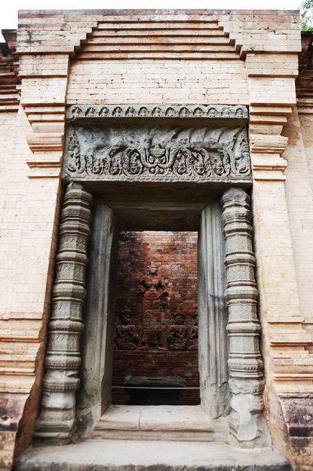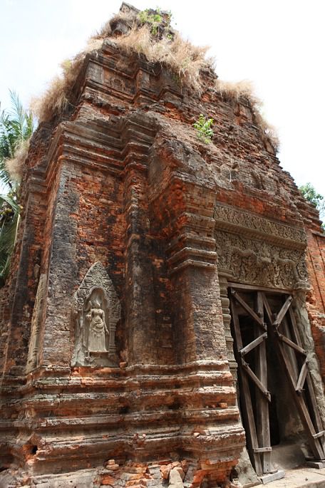 豆蔻寺(Prasat Kravan):建于公元921年,是一个规模不大的寺庙,五座一字排开的砖结构寺塔非常罕见。我们下车后直接上到塔的基座上,正面看所有的塔都是红砖封门,绕到后面忽然看见最右侧的砖塔门框上有精美的雕刻,再往里面看真的是大吃一惊,里面的墙壁上是一组浮雕,毗湿奴站在Naga身上,毗湿奴横跨在圆盘、海螺和球上,在毗湿奴旁边有两个膜拜者,雕刻得维妙维肖,这组雕像不是石雕而是砖雕,由于建筑材料用的红砖,因此整个豆蔻寺都有着暖暖的色调。豆蔻寺的前面是一片开阔地,司机纳文说,这里经常被一些大公司租用,所以经常会搭台子架灯光什么的,不光破坏环境也对古庙造成威胁,看样子钱的作用的巨大的。