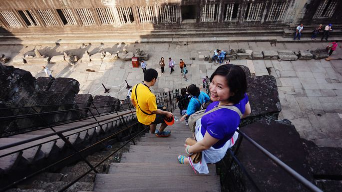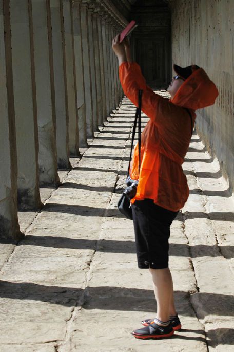 我们下午到达小吴哥时太阳很毒,淡季人不算多,我们就在外围廊玩,坐在台阶上看人来人往,快4点了才开始往主寺里走,需要提醒的是,主寺的最高层4:30就不让上人了,5点开始清场,所以必须在4:30之前到达上主寺的楼梯前。我们边走边拍照边看雕刻,差点误了时间,到了那座被称为通向主塔的“天堂阶梯”时,我吓了一跳,梯子高几十米,几乎与地面垂直,我都怕我背的摄影包把我坠下来,一咬牙手脚并用的爬了上去,这也算是让我体会一下天堂之路的艰辛吧。
