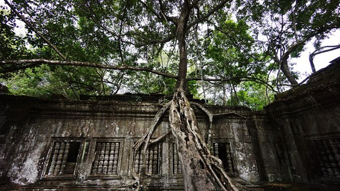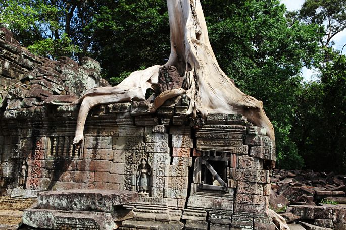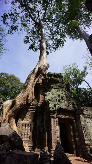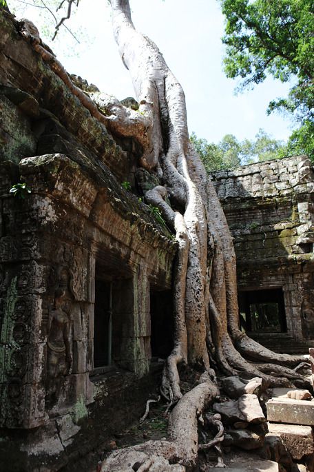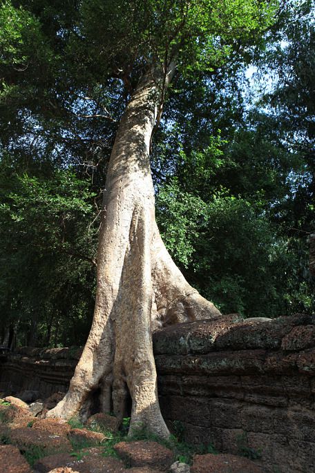 塔布伦寺(Ta prohm)是吴哥建筑中的主要寺庙之一,由于还是好莱坞大片《古墓丽影》和《花样年华》的拍摄地,故而更加声名远扬。其实塔布伦寺里的参天古树是该寺最显著的看点,当年吴哥遗迹被发现的时候,这里的树木几乎已经将整个寺庙全部“包裹”了起来,树从建筑的中间生长起来,树缠石、石包树,树与寺庙紧紧相拥,这种缠绕寺庙建筑的树叫吉贝树,根系既粗又壮,它与寺院浑然一体,却又无时无刻不在伤害着寺庙,有考古学者指出,古树的生长速度最终会使塔布隆寺成为一片废墟。百年的老树和残破的寺庙让人迷恋其中,我们算到的早的,在里面疯玩了一会儿,游人越来越多,不管你想拍什么都要等,所以,一定要早点到,人少
