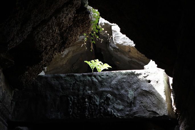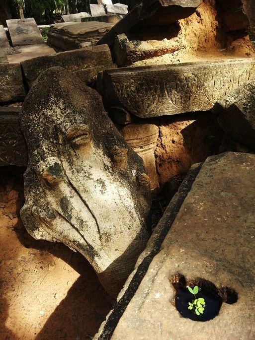 从暹粒到崩密列开车要1个半小时,柬埔寨没有高速公路,一路是柏油路与砂石路交替,车不多风光也不错,纳文一直在介绍柬埔寨老百姓的生活状况,国内挣钱的事儿全部被几大家族垄断了,一些好项目(如吴哥窟的管理由政府引进越南的资金,全部是越南人在管理)被合资了,那景区的百姓只能做点和旅游相关的事儿,如开突突车、出租车、餐馆、卖纪念品什么的,寺庙周边连庄稼都不让种,老百姓的生活确实挺艰难的,纳文说人均生活费每天大概1美元,一般的家庭供孩子读书都是一笔很大的开销,所以,政府官员的贪腐让老百姓深恶痛绝。到了崩密列,5刀买张门票进来,原本崩密列”意思是“荷花池”,但旁边河花池中已经没有了荷花,寺庙周围原本是一条很宽的护城河,如今都已干涸,我们顺着土路往前走,一路都看见摆着的多头蛇神像,到了已经坍塌的南门前,坍塌的景象一片狼藉,我忽然看见一块条石上,有一个形状像熊猫似的臼孔,孔内灌满了雨水,水中居然长着一颗充满生命力的绿草,好喜欢这个画面,生机勃勃充满希望。