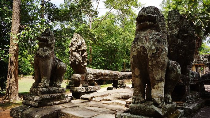 南门(South Gate)城门高达23米,上方为巨大的四面佛像,面露安详的微笑,是吴哥古迹的标志之一,南门外的护城河上有座石桥,桥的两侧栏杆上各有一排54个石雕的半身像,一边代表神灵,另一边代表恶魔,他们手上拉着眼镜蛇化身的巨蛇王。南门的路很窄现在依然在使用,我们到的比较早没什么游人,看着柬埔寨的老百姓骑着自行车进进出出的恍然回到70年代的中国,步行穿过南门的门洞,眼前是参天的古树整齐地列在道路两旁,阵阵轻风吹过说不出的惬意啊。