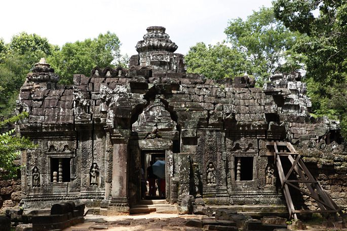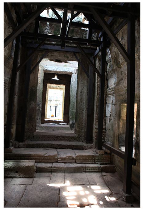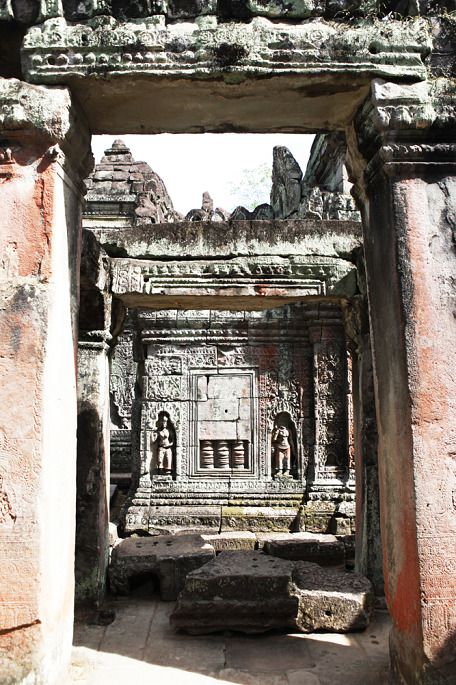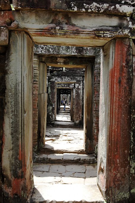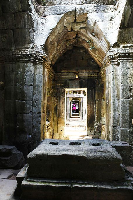斑黛克蒂寺(Banteay Kdei),这座寺庙拥有四面佛城门和城墙,与塔布隆寺风格相近。都是由很短的走廊连接着主殿和中央高塔,主殿和高塔被外边的两层围廊包围,书上介绍中心塔内部建设并未完成,所以,到处是耸立的石柱和宫殿坍塌后残留的窗框,从每个窗口看出去都可以看到不同的风景,特别是走廊那一个个的门框,简直就是让人拍不够的素材,随意搭起的条石和残破的雕刻图案,使得镜头下的古寺庙更显沧桑。比起刚刚离开的游人狂多的塔布隆寺,这里算的上是清幽之地。纳文的车把我们放在西门,然后去东门等我们出来,一般参观都是西门进,东门出,在东门你能看见门上面的塔尖也有四面佛像。出了东门后就可以看到对面有一片水塘,那个就是原来的皇家浴池,那儿是我们中午吃饭的地方,到吴哥窟玩的这几天,只有今天是在外面吃的午饭,因为晚上要看日落,回宾馆吃饭休息时间上确实紧张。