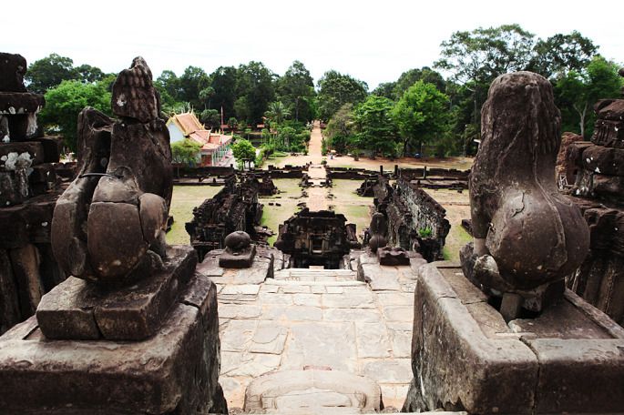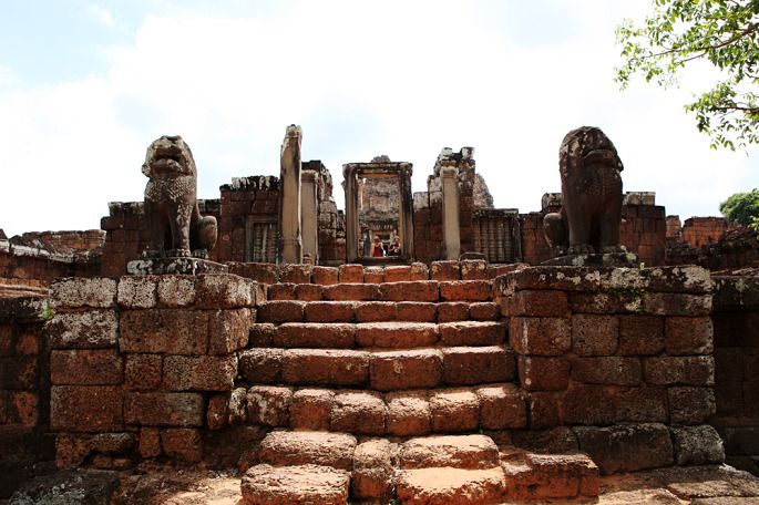 东梅奔寺(East Mebon),可能是建于10世纪,是供奉印度教湿婆的庙宇。现在寺庙中只有一组大象和门的雕刻保存得最好,从雕刻上精细的刻画和其高大的身架,可以想像当时寺庙的巍峨和精美。古印度神话中认为天地四方尽头各有一只神象支撑,东梅奔寺四角上这四只大象就是这样寓意。站在东梅奔寺上往远看,原来的那种壮观和气势你依然能体会出来,和别的寺庙的感觉也不一样,我挺喜欢这个寺庙的很值得一看!