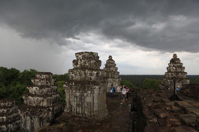 巴肯寺(PhnomBakheng):建在巴肯山顶,体现了当时高棉人对山的崇拜,庙山为陡峭的五级台基,正方形,高13米,底层长76米,逐层缩小到顶层长47米;陡峭的庙山象征须弥山。庙山顶部的五座宝塔,象征须弥山的五座山峰,台基四边中央,各有陡峭的五层石阶,每层十级,直通寺顶平台,每层石阶左右,守护着一对坐狮,现在登寺的木梯就是沿着原来的石阶搭建的,但两旁的石狮有些已破损,看不出狮子模样了。围着寺庙转了一圈,巴肯山顶是附近唯一的制高点,可以说是居高临下的俯瞰了吴哥窟,然后我们坐在主寺西边的台阶上等待日落,老天不给力,眼看着天边的乌云向我们头顶逼近,雨来了,急一阵缓一阵大一会儿小一会儿的,不光我们在打伞坚持,还有很多人就这么淋着雨守候在那里,黑云压城城欲摧,乌云下的巴肯寺有种大片的画面感,呵呵,这种场景也是可遇不可求的吧,看日落是没戏了我们赶在天黑前下了山。