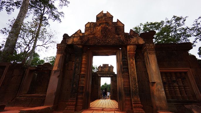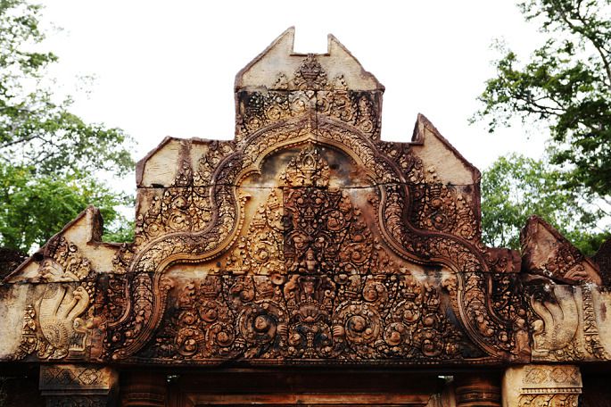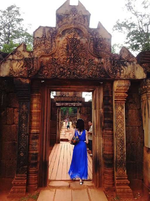 班蒂斯蕾寺(Banteay Srei) ,又叫女王宫,距吴哥城约25公里,是柬埔寨三大圣庙之一,称得上是吴哥景区中管理的最精心的寺庙了,女王宫有“丛林珍珠”之称,跟吴哥其它的庙宇不同,她整体采用了粉红色的沙岩,透着一股安然,温柔的味道。参观女王宫一般都是从最东边的瞿布罗(Gopura拱门)进入,大门的山形墙面朝东方,我们为了拍张大门的镜头,一直在等旅行团的游客过去,最逗的是等的过程总能听见带团中文导游的解说,知道女王宫和中国之间的关系吗?你们看这儿,一个大象三个头玉皇大帝坐上头……,仔细看看浮雕这是啥玉皇大帝呀哪儿跟哪儿呀。终于大拨的游客过去了,想等没人再拍照还真有点难度,抢拍了一张蓝衣美女配红山墙雕花门框,有点子意思哈!