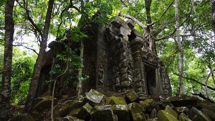 在堆砌的乱石边有一条木头栈道,沿栈道往前,丛林的神秘气氛在断裂的柱石、坍塌的墙壁间弥漫。崩密列的主殿也已倒塌,四处的断壁残垣引人遐想,让人忍不住的想去探索,上百年来,巨大的树木在这里肆意生长,和残留的建筑纠缠不清,融为一体。温柔的阳光透过树隙,斑斑驳驳洒在那些雕刻精美的石门、墙壁上,我们在堆满石柱和石块的门洞里爬进爬出,光影交织中有很多摄影的好素材,一切还都是被发现时的样子,乱石、树藤,残墙、断壁,巨大规模摆在那里,一看便可知,崩密列在世时,曾是堪比宏伟吴哥寺的重要寺庙,说它是“沉睡丛林的吴哥寺”一点不为过,崩密列的原始美有着令人窒息的效果!