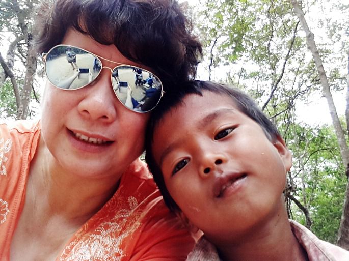 神牛寺的对面是一个用简易棚架搭建起来的孤儿学院,叫小天使皮雕孤儿学院,进去左手边是皮雕的工作区,右手边是皮雕作品展售区,有孩子正在制作雕刻皮画,我们选购了一些皮雕作品并且和小作者合影留念,和那些在寺庙争抢糖果要钱要物的孩子相比,孤儿院的孩子们更让人疼爱,他们彬彬有礼靠自己的能力挣钱读书养活自己,当我们准备离开时,他们唱起了我们熟悉的中国歌曲:我爱北京天安门、两只老虎……,一连唱了5、6首,最后用标准的普通话对我们说:谢谢姐姐,谢谢哥哥,祝哥哥姐姐身体健康、万事如意!可能这话他们已经说过不下百遍千遍,但他们眼睛里的真挚、感恩,我们是能感受到的,以后如有机会再去,一定给他们带上他们需要学习用品,支持他们自立自强、实现梦想的努力!