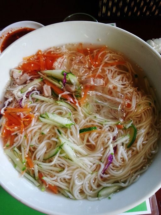 中午回宾馆,就在宾馆的侧门边上,我们看见一家韩国菜馆,玻璃窗上贴着的菜谱,一盘诱人的酱肉,大家决定吃韩餐,韩餐馆的老板在中国工作过会一点中文,我们每人点了一碗朝鲜冷面,点了一份酱肉,正要点别的菜,老板过来说,不用,全部、全部,并用手对着我们划了一圈,将信将疑的我们没再点菜,又点了一些啤酒饮料,等酱肉上来,好嘛那一大盘子肉+骨头,再加上配菜摆满了桌子,而且,那个朝鲜冷面和在国内吃的也不同,不但没有牛肉和鸡蛋,连泡菜都没有,醋、泡菜,隆总往面碗里不停的加,我加了点冰块和泡菜,但味道也不如北京西四的朝鲜冷面,我们6个人把店里的泡菜和冰块都吃光了,不过结账时小费也多给些,把老板乐的,酱肉很好吃的推荐啊,就在暹粒吴哥柳叶酒店的侧门边儿。
