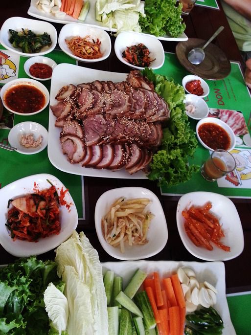 Cambodia BBQ ,柬埔寨BBQ是烧烤和火锅的组合,中间烤肉,周围一圈是火锅,涮蔬菜和面条,配上东南亚口味的酱料,味道很不错