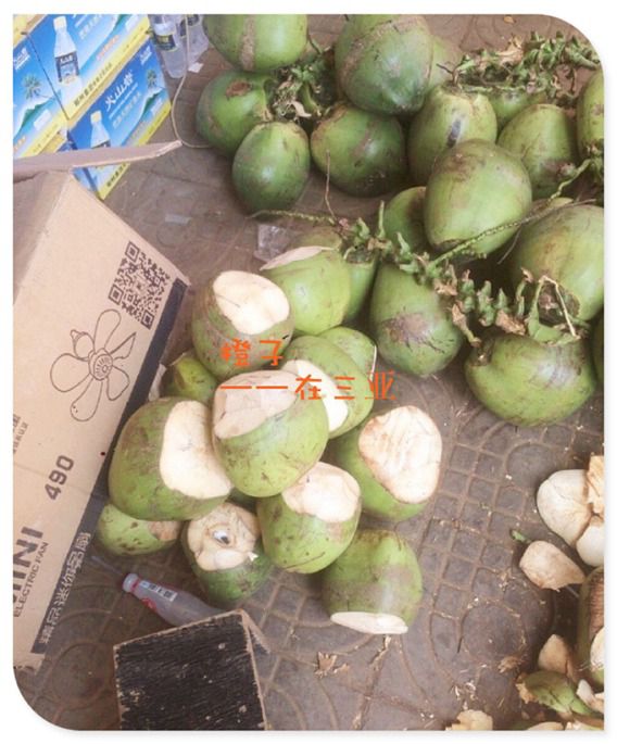路上看到椰子,想起来,来三亚好几天,清补凉喝了不少了,还没喝过新鲜的椰子呢,赶紧抱上一 个,边走边尝,椰汁酸甜酸甜的,是有点透明的汁液,不像超市买的椰汁是乳白色的,好像有点喝不惯的感觉