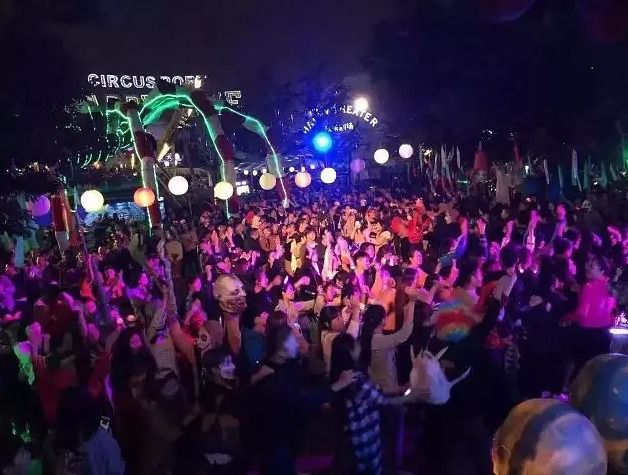总算从尖叫连连的鬼屋出来了,外面的世界也是各种鬼各种游荡,大家和这些万圣巡游的小鬼们一起跳起了广场舞。
