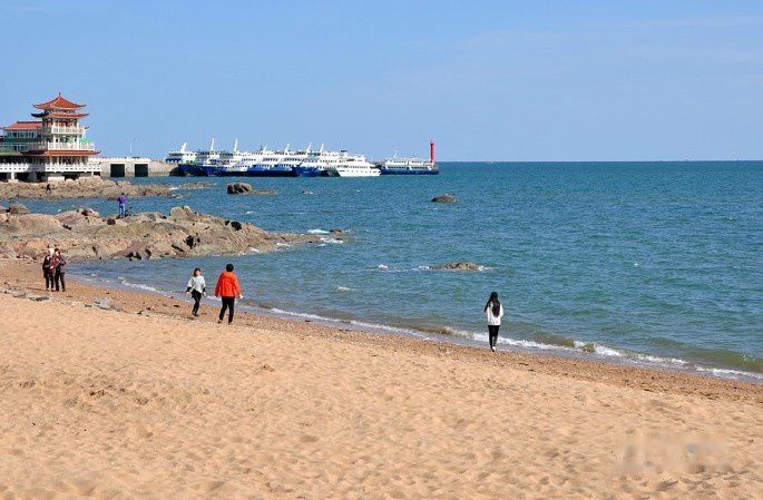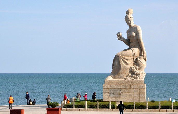 从火车站乘1路公交车到终点站,下车后就能看见兴城海滨风景区入口处的一座高高的牌坊,当你穿过牌坊,抬眼即可望见上图中这尊“菊花女”的雕像及其身后一望无际、湛蓝色的大海,而从雕像平台顺着台阶往下,就是沙滩了。雕像基本位于整个海滨景区居中的位置,往北(左),是兴海公园、观海广场、觉华岛游船码头;而向南(右)则有三礁揽胜、滨海木栈道等景观。