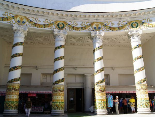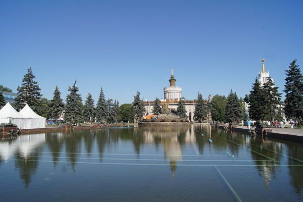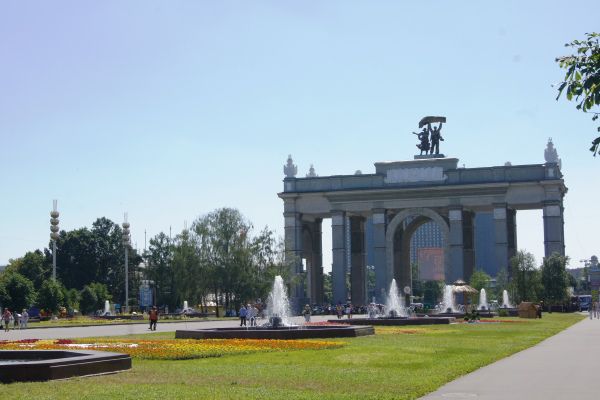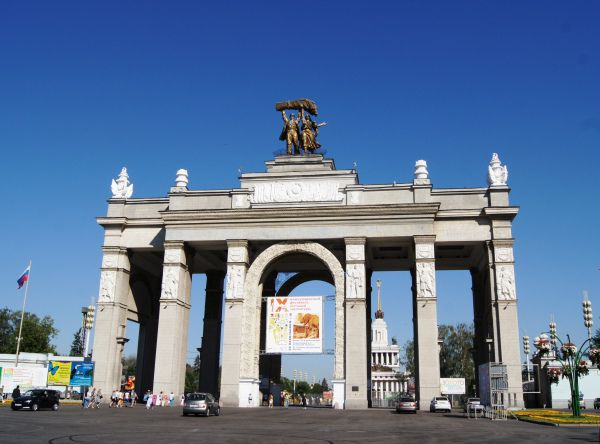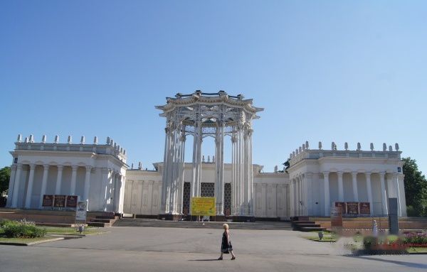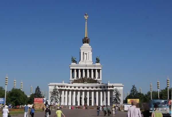 国民经济成就展览馆,现在是莫斯科的一个展销中心。它在1935年开始建设,1939年对外开放,1941年因苏德战争爆发暂停。1948年开始重新改造直到1954年才对外开放。在里面每个俄罗斯的少数民族都有属于自己的建筑,许多建筑上都有编号,我们看见的编号就有近百个。前苏联时期国民经济成就展览馆曾是令世人瞩目的国家展览馆,是俄罗斯人一直为之自豪的地方,不仅因为它是俄罗斯最主要的展览馆,也是一座给人们带来梦想和希望的大花园,更重要的是它充分体现了国家的历史、文化、科学和艺术。这座具有70多年历史的展览馆随着时代的变迁几次易名,最初为全俄农业展览馆,五十年代末叫国民经济成就展览馆,现在叫做全俄展览中心。在苏联时期它用于展览苏联各项科技成就以及各加盟共和国的风采和文化,在这里召开各种学术研讨会议。如今一部分展馆改造后以市场的形式对外出租,里面有一个馆叫“深圳馆”应该是中国人租的。还有一些建筑看着好像是荒废着,真是好可惜。我们上次来只转了它的一小部分,整个展览馆太大了,来了两次都没有看到它的全貌。