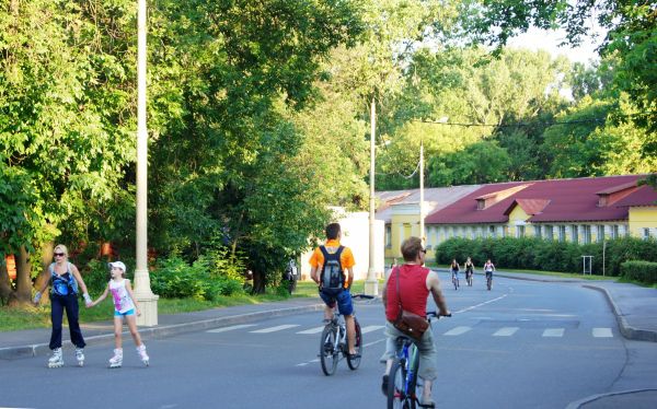 这边的路宽了许多,路上有很多骑自行车的人、滑滑轮的人。这个院子里应该是个公园,这些人在公园里锻炼呢!
