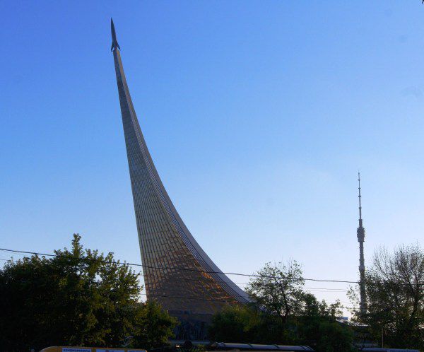 在展览馆的大门外,看莫斯科电视塔和宇航纪念塔。